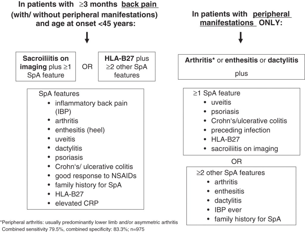 Rudwaleit M, van der Heijde D, Landewé R, et al. The Assessment of SpondyloArthritis international Society classification criteria for peripheral spondyloarthritis and for spondyloarthritis in general. Annals of the Rheumatic Diseases 2011;70:25-31.