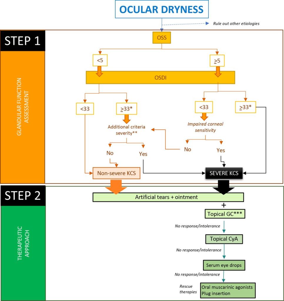 Algorithm of glandular function assessment and therapeutic approach in patients with primary SjS presenting with ocular dryness. *Consider neuropathic pain if OSS≤1. **Additional criteria for severity: (1) impaired visual function (photophobia, visual acuity modification or low contrast sensitivity); (2) blepharospasm (secondary to ocular inflammation); (3) severe meibomian gland disease or eyelid inflammation. ***For short-term indications (2–4 weeks). CyA, ciclosporin A; GC, glucocorticoid; OSS, ocular staining score (Whitcher107 JP, et al. Am J Ophthalmol. 2010;149:405–15). OSDI, ocular surface disease index (adapted from Baudouin C,108 et al. Br J Ophthalmol 2014;98:1168–1176); SjS, Sjögren syndrome.