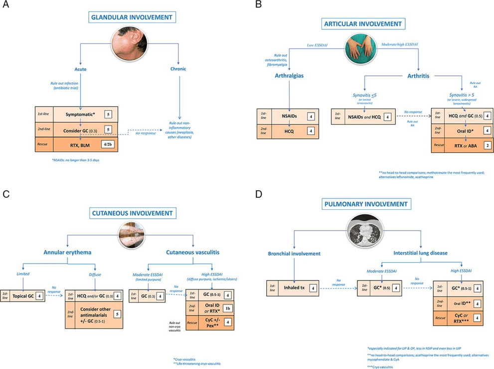 A to I) Algorithm for the therapeutic approach to patients with primary SjS presenting with organ-specific systemic involvements. NSAIDs: no longer than 7–10 days. HCQ: hydroxychloroquine 200 mg/day. GC (recommended dose in mg/kg/day); short-term course whenever possible; consider methylprednisolone pulses in severe cases. ID: immunosuppressive agents, no head-to-head comparisons. CyC: cyclophosphamide pulses 0.5 g/15 day (maximum six pulses). Rituximab: rituximab 1 g/15 days (x2). BLM: belimumab; 10 mg/kg (0, 2 and 4 weeks and then every 4 weeks). ABA: abatacept 0, 2, 4 weeks and every 4 weeks. IVIg: intravenous immunoglobulins 0.4–2 g/kg 5 days. PEX: plasma exchanges. CyA, ciclosporin A; EULAR, European League Against Rheumatism; ESSDAI, EULAR Sjögren”s syndrome disease activity index; GC, glucocorticoid; LoE, levels of evidence; NSAIDs, non-steroidal anti-inflammatory drugs; RA, rheumatoid arthritis; SjS, Sjögren syndrome.