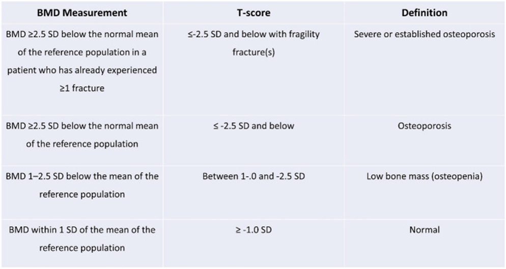 This classification devised by the WHO (World Health Organization) utilizes T-scores in BMD reporting of women in menopausal transition or postmenopause and men ≥ 50 years [2]